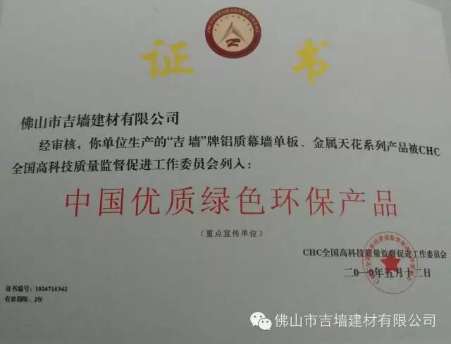 當前位置:鋁單板廠(chǎng)家 >>其他圖庫 >> 榮譽(yù)證書(shū) >> 中國優(yōu)質(zhì)綠色環(huán)保產(chǎn)品專(zhuān)注定制吉墻 質(zhì)量為根 服務(wù)為本